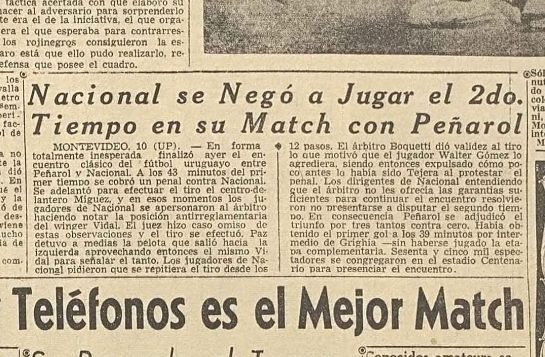 Se jugaron solo 45 mins porque los tricolores no se presentaron para la disputa del segundo tiempo para evitar una histórica goleada en contra y éste hecho, bastante reñido con lo deportivo, quedó apodado y conocido como "La Fuga". Algunos medios de la época titulaban: El Día decía: "Hay que saber perder y luchar hasta el fin". El periodista Dionisio Alejandro Vera (Davy):afirmó: "Digan que Nacional se retiró, porque si no le encajaban seis". El Plata publicaba: "No hubo relación proporcionada entre causa y efecto, pero aunque la hubiera, tampoco se hubiera justificado el abandono de la cancha. Nacional no volvió porque habiendo quedado con nueve hombres temió caer por un escore de guarismos sensacionales. Esta debe ser la verdad auténtica. El secreto no radica siempre en saber ganar. Es preciso tener temple y elegancia para saber perder y Nacional no supo elegir el verdadero camino. El deshonor le pesará eternamente". Recaudacion: $ 29.549,40. También estuvo en disputa la Copa Olinda Bozan – Nicolás Mesutti