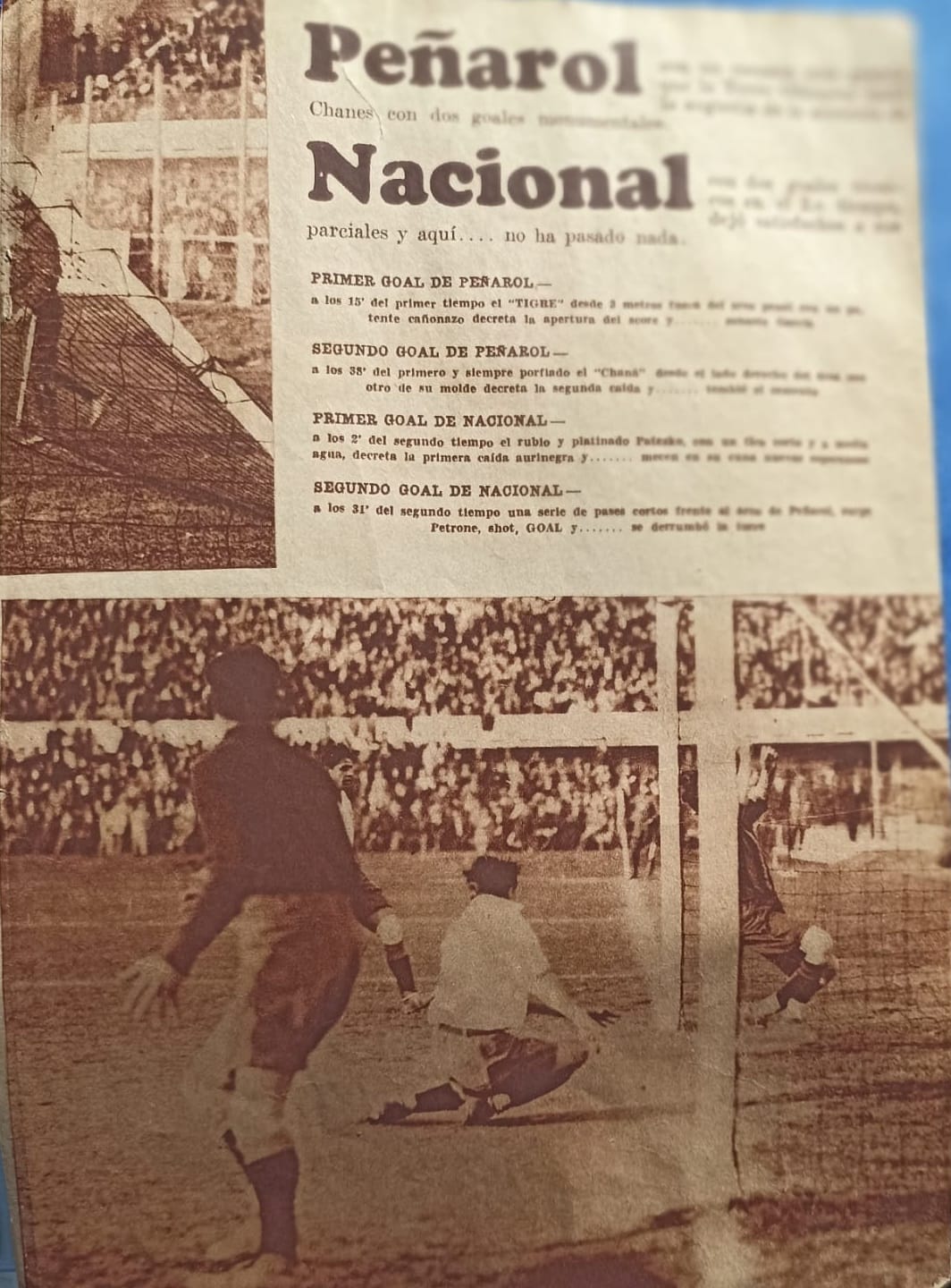 El clásico del gol de la colgada. A poco de iniciado, debió retirarse fracturado Galileo Chanes, jugador de Peñarol, que a los 08' tuvo un choque con Arsenio Fernández. Nacional había ganado todos sus partidos y nadie había podido vencer a su arquero Eduardo García, hasta el clásico, en el que un zapatazo del Tigre Young se coló a media altura. El estadio enmudeció por unos instantes, pues la pelota no cayó dentro del arco. ¿Habría roto la red? ¿Se había ido afuera? ¿García mantendría el invicto? Ocurrió que la pelota estaba colgada entre el caño que soportaba la red y la misma red. José Nasazzi gritó que no la bajaran y el comisario de servicio, de apellido Talera, la sacó de allí con la vaina de su sable. Recién entonces fue gol para todos, al caer al piso