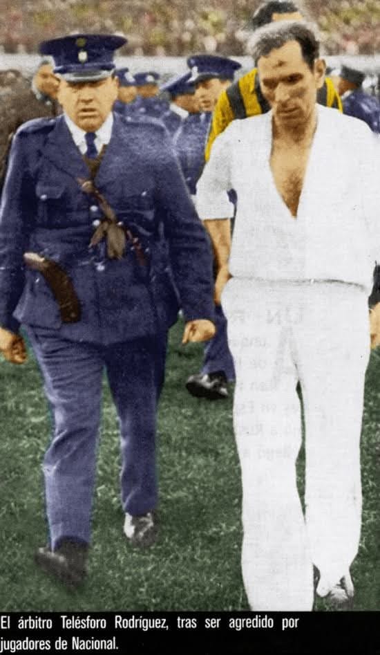 El Clásico del comisario. El Patrullero Vidal hizo el primero y cinco minutos más tarde Chirimini el segundo. Al comienzo del tiempo complementario descontó Walter Gómez; pero a los 24 minutos el juvenil Piñeiro metió el tercero para el carbonero. Apenas dos minutos más tarde Chirimini tomó la pelota, eludió a varios defensas de Nacional y entró al arco con la pelota dominada. Golazo. Eusebio Ramón Tejera, zaguero izquierdo de Nacional, que lo corría de atrás, entró también al arco y en la humillación no tuvo mejor idea que agarrar a patadas a su rival. Chirimini cayó al suelo y desde allí se defendió también a patadas: “consiguió incorporarse a medias, tratando entonces de esquivar los golpes que le dirigía su adversario” (Diario El Día). El juez los echó y Obdulio protestó la decisión. Tejera trató de llevarse también al capitán de Peñarol y lo atacó. Entonces sucedió lo insólito: el comisario de servicio en el campo sacó de la cancha a Obdulio Varela a pesar de que el juez no lo había expulsado. Unos dicen que por su cuenta, otros que por orden de Abelardo Véscobi (reconocido hincha de Nacional), jefe de Policía de Montevideo. Para completar, como Obdulio se resistía, la policía atacó a Obdulio a “palazos”. El juez en su informe expuso los hechos: Dejo constancia que a los 23 minutos del segundo tiempo expulsé a los jugadores E. Tejera de Nacional y O. Chirimini por agredirse mutuamente y a Obdulio Varela por indicación de la policía, éste de Peñarol. En lo que respecta a esta expulsión fue decretada por el comisario 1° Julio C. Cresci de la 1ª sección. [Fdo.] Galilleo Bianchi. Por única vez en la historia, un jugador fue expulsado por un comisario.