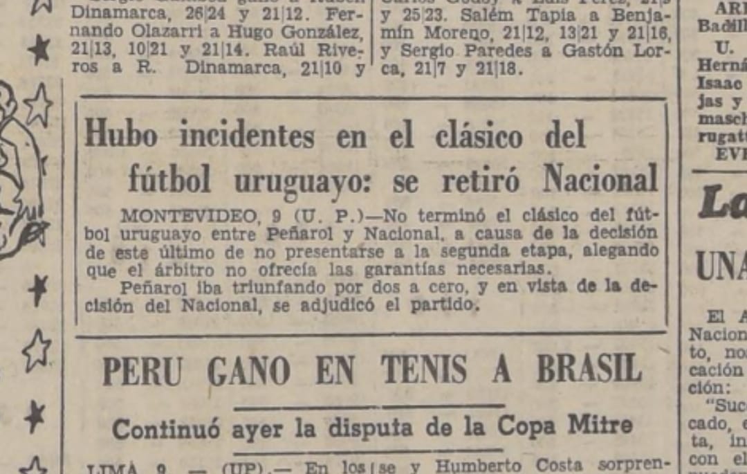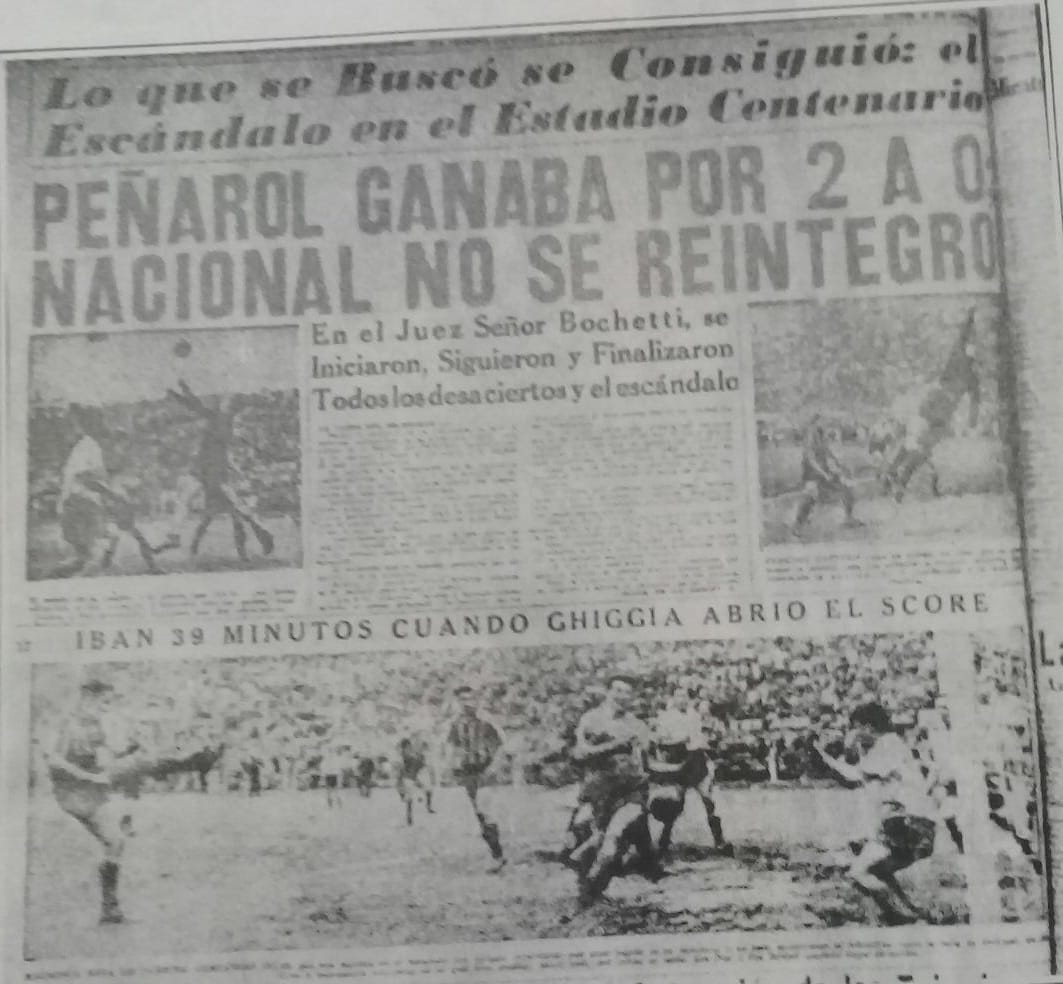 Se jugaron solo 45 mins porque los tricolores no se presentaron para la disputa del segundo tiempo para evitar una histórica goleada en contra y éste hecho, bastante reñido con lo deportivo, quedó apodado y conocido como "La Fuga". Algunos medios de la época titulaban: El Día decía: "Hay que saber perder y luchar hasta el fin". El periodista Dionisio Alejandro Vera (Davy):afirmó: "Digan que Nacional se retiró, porque si no le encajaban seis". El Plata publicaba: "No hubo relación proporcionada entre causa y efecto, pero aunque la hubiera, tampoco se hubiera justificado el abandono de la cancha. Nacional no volvió porque habiendo quedado con nueve hombres temió caer por un escore de guarismos sensacionales. Esta debe ser la verdad auténtica. El secreto no radica siempre en saber ganar. Es preciso tener temple y elegancia para saber perder y Nacional no supo elegir el verdadero camino. El deshonor le pesará eternamente". Recaudacion: $ 29.549,40. También estuvo en disputa la Copa Olinda Bozan – Nicolás Mesutti